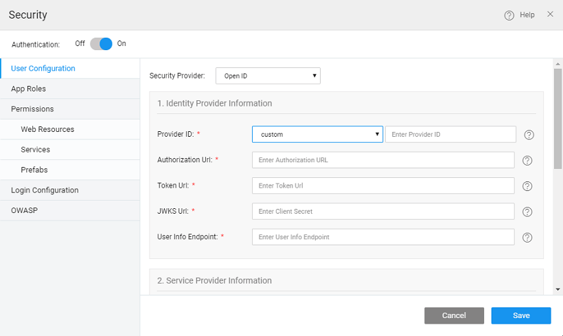 WaveMaker allows you to authenticate your apps with OpenID. Setting the Security Provider to OpenID will allow you to configure a Service Provider of your choice.