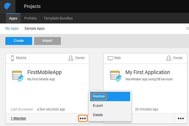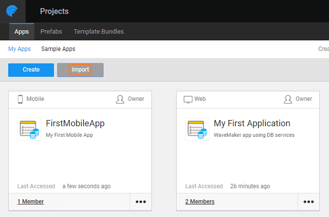 You can import a project or a prefab in the ZIP format using the Import from the Project Dashboard. Choose the file from the import dialog and click on Import. These are the files that were created from the Export option of WaveMaker Studio as discussed above.