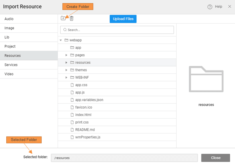 3. Select the appropriate folder, and Upload Files that need to be imported. You can select multiple files to import. Note: Be sure you select the proper folder, this will be used by the binding dialog to filter the files. For example, if you are using an Image widget, you will be selecting the Image type resource and WaveMaker will display only the files from the Images folder.