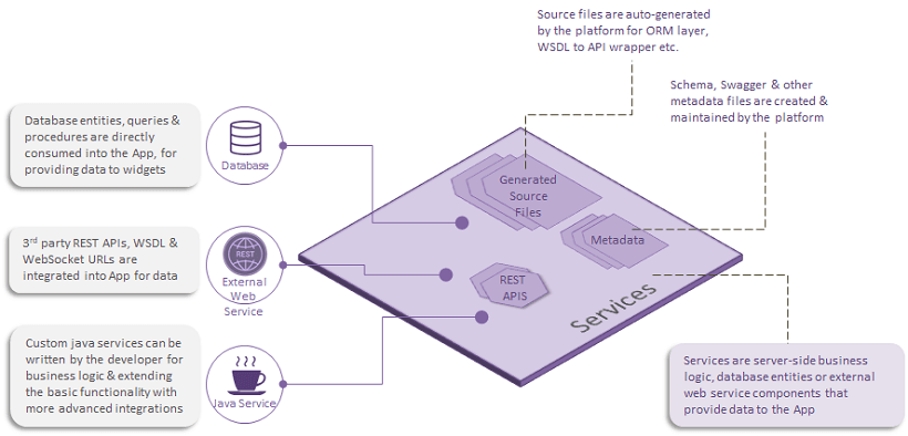 ORM Layer is auto-generated from DB schema using Hibernate & JPA. Services Layer is auto-generated using Spring. Custom queries, procedures, and Java Services can be used to extend the app functionality. For all these services, REST API is auto-generated using Spring-REST/Swagger. Variables interact with REST API layer to access the services.