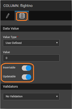 The Insertable and Updatable options can be configured for User Defined and Server Defined value types for Database columns. For Database Defined value type these are implicitly set to false. Insertable and Updatable options are provided under Data Value group for the columns in the Database Designer.