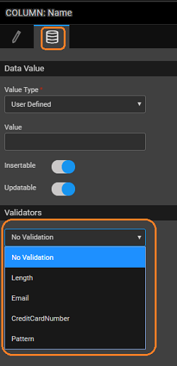 There may be situations where you might want to set validations for user-defined columns. This can be achieved by an option to select the validation from the list of default validators list for the column based on the data type. This option is available on the properties panel for the selected column.