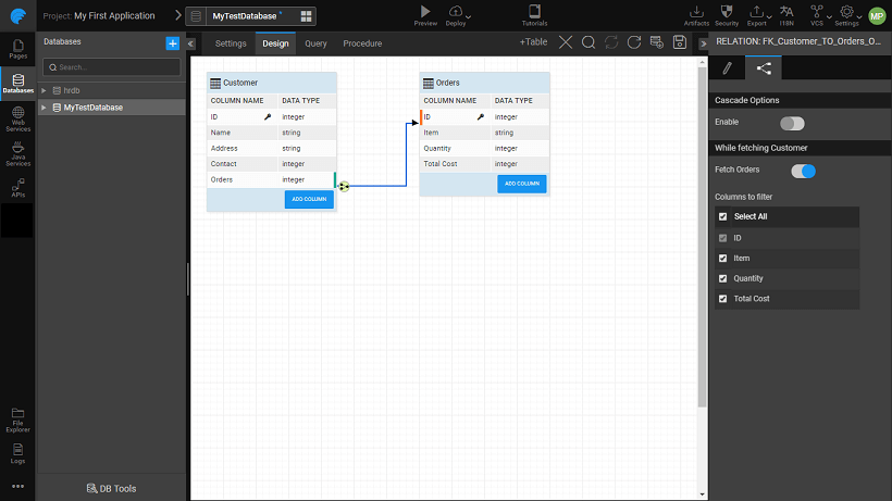 Relations are a way to establish a connection between tables within a given database. It takes care of the consistency while linking two tables. In WaveMaker, there are two ways of creating relationships:
