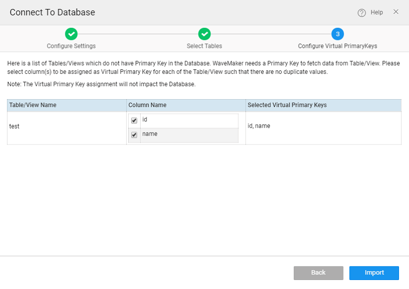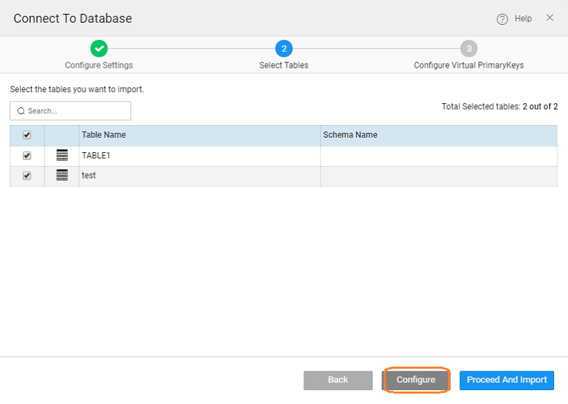 While connecting or importing the Database, select the Configure option to assign Virtual Primary Key.