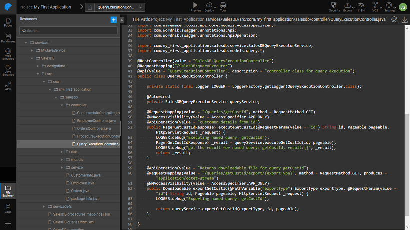 This layer exposes the methods related to the configured query and procedures. Controller layer uses these methods to complete the user requests. We recommend using methods from this layer in custom Java services.