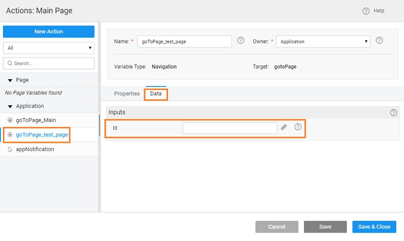 • The Application-scoped Navigation Action generated by default by WaveMaker for test_page can be used to bind a value for the id field from the Main Page. The param will be available in the data tab of the Actions (goToPage_test_page). You can also create another Navigation Action and use it in a different navigation flow.