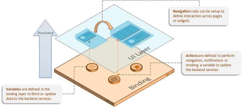 The binding layer provides a low-code approach to defining data flows, interaction, and integration of UI elements with the backend services.