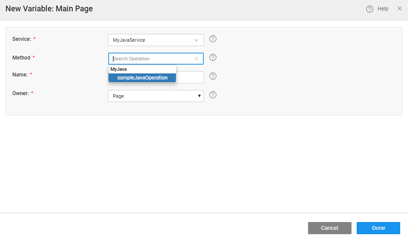 For each method within the Java Service, a service variable can be generated using the appropriate option from the Operation property; with the input parameters available within the Data tab and the output available as the datavalue for binding. You can invoke the Java Service by triggering a call to the Service Variable generated. In case you have multiple public class methods in your Java Service, you will see multiple Operation options.