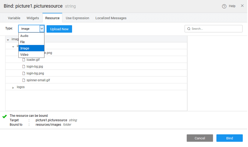 From the Property panel of the media widget, find the Source property. Click the Bind icon represented by a chain-link as shown in the picture below; a Bind modal dialog pops up.