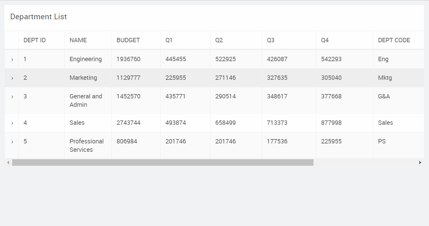 Row expansion is a property in the data table widget. By enabling the row expansion, you expand a row horizontally to view additional information of the expanded item. This feature appears as a small arrow placed on the left column of the table field. When you click the small arrow, the row expands as illustrated below. Using the row expansion, you can connect to different data sources and call information from multiple tables, web and REST APIs. For example, you can use Salesforce API to view “quick information” on the same page without needing to open a new tab or a new page.