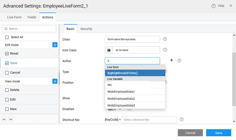 - You can invoke the hightlightInvalidFields method on Save action from the Advanced Settings, to highlight all invalid fields in red and display appropriate error messages.