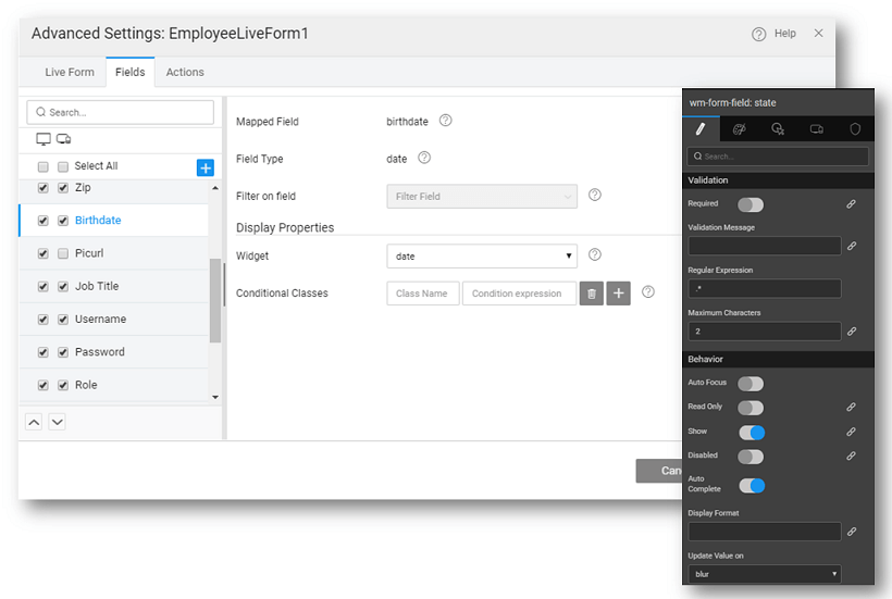 - modify the behavior of individual fields, from the canvas, by selecting any field on the form and setting the properties:
