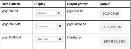| Output Format | Defines the format of output datavalue returned by the date widget. Default output format is 'yyyy-MM-dd', which returns the equivalent data value. E.g data value for '19/06/2015' is '2015-06-19'. If the output format is given as 'MMM dd, yyyy', widget returns datavalue as 'Jun 19, 2015'. |