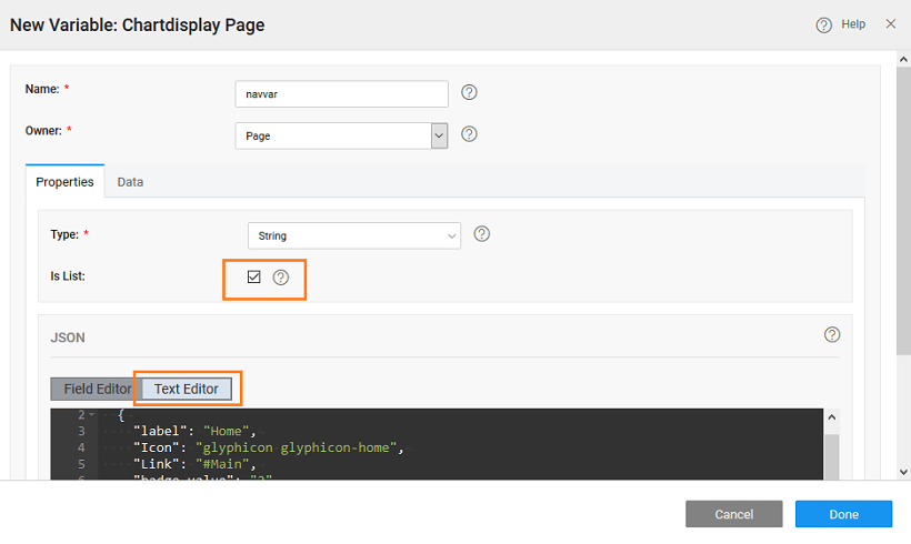 1. Add the following in the Text Editor, this defines the structure for Menu identifying Label, Icon, Link, Badge Value and sub-action. Icons can be halflings from glyphicons or font awesome icons.