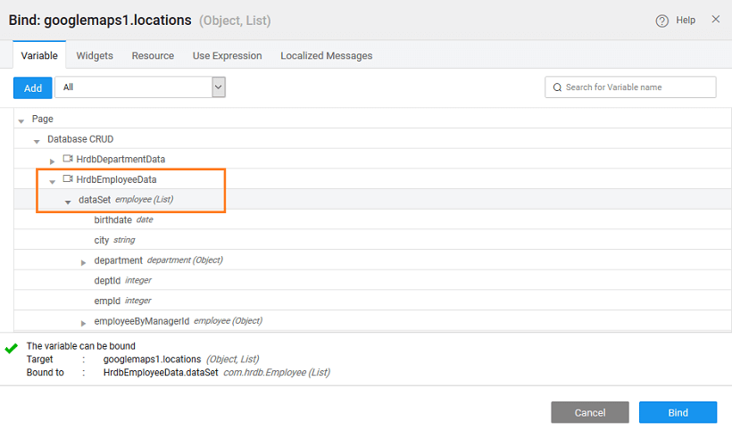 - Bind the Locations property to a database which contains the address fields. Here we are using HrdbEmployeeData table from the imported Sample DB.