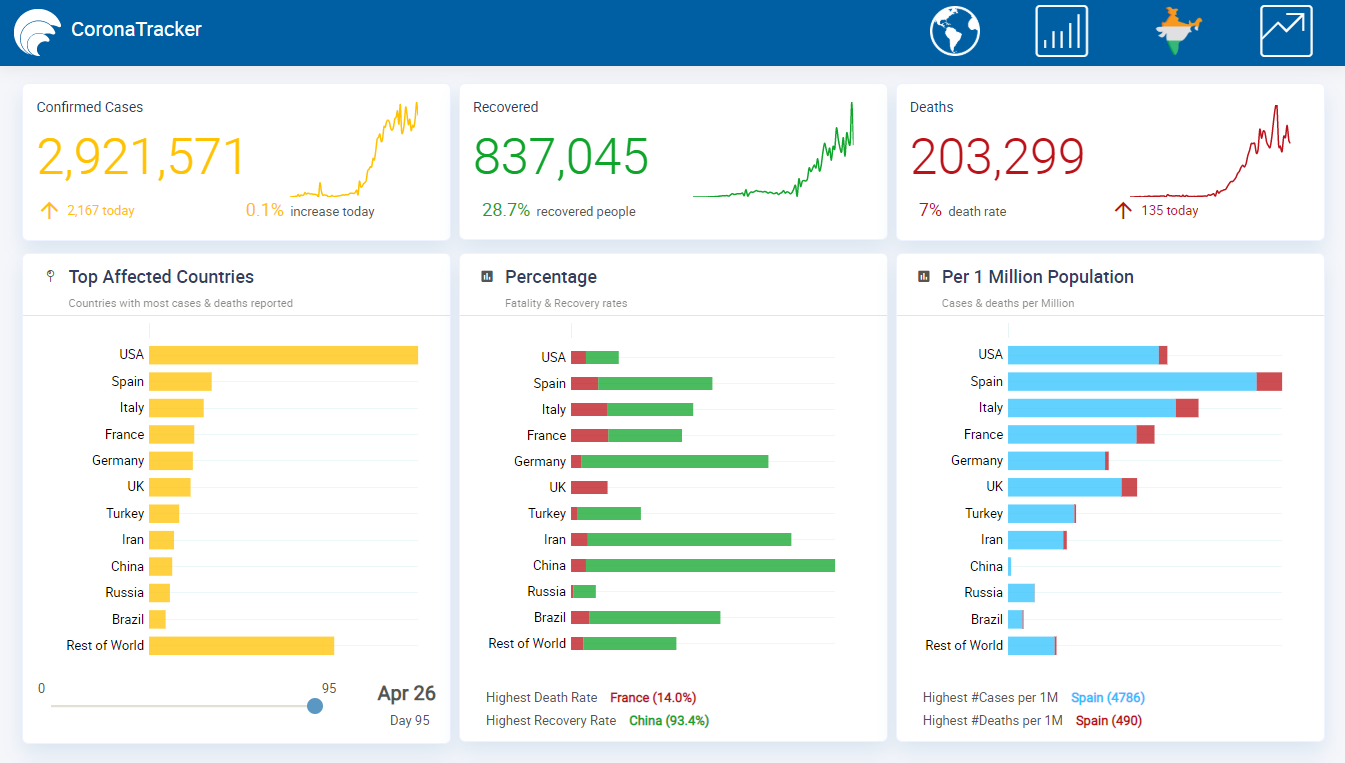The Corona Tracker application has an extensive dashboard with key metrics globally, i.e. Confirmed cases across several countries, recovered, deaths reported etc. The dashboard provides visualization for top 10 affected countries, plotting their death rates against recovery percentages, number of affected people in 1 million population etc.