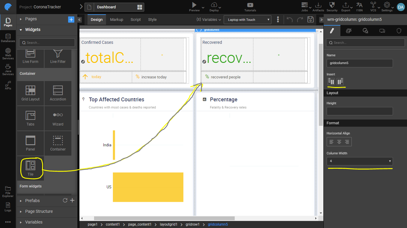 Key metrics for confirmed cases, recovery & deaths are built as tiles as shown. Each tile is further divided into sections using a Grid Layout which can be further customized to represent the data. Grid Layout is used to define the arrangement of various widgets on the page, by dividing the page into several responsive blocks. The size of each block can be configured and new columns and rows can be inserted as needed.