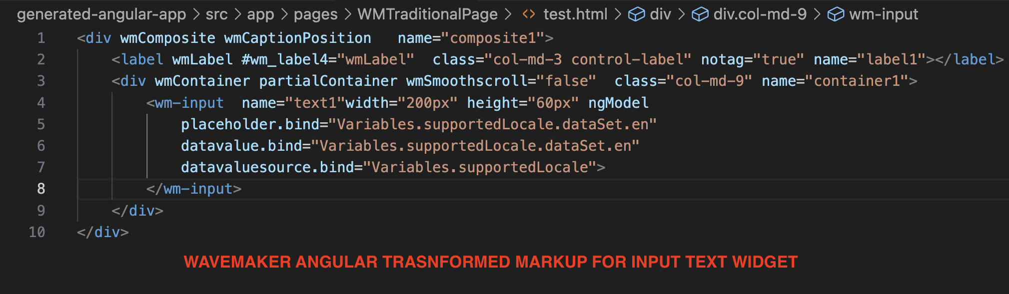 WaveMaker Angular generates templates that include markup for widgets and input bindings.