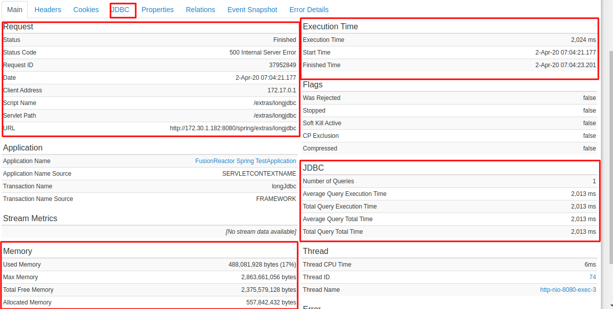 You can view details of the running transaction request with data related to JDBC Query analysis and Profiler for method execution times and more sections, which help you identify the root cause of the slowness.