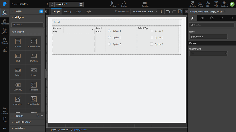 4. Drag and drop a Select, Radioset, Checkboxset and a Label widget onto the canvas.