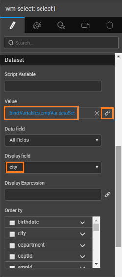 • Select: bind it to the Employee - Set the datafield property to city and display field also to city. The display field is the value that the user sees while the datafield is the value that is internally represents the display value. In this case both are the same.