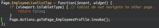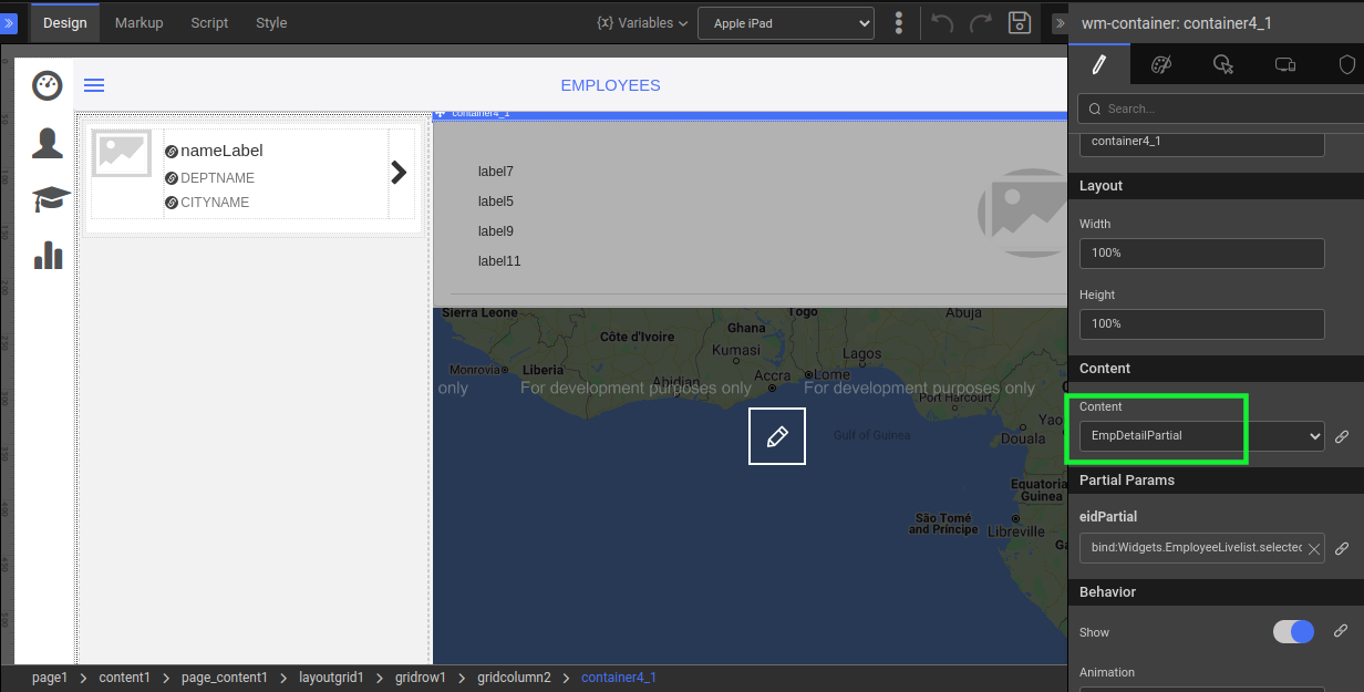 Design a partial page that contains the employee profile in detail with Employee ID Param. Bind this partial to the selected-employee based on the Employee ID Partial Param to display the Employee Profile. For more information, see How to create a Partial.