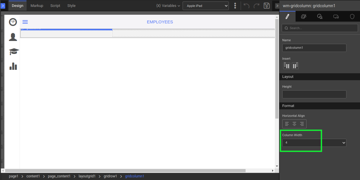 columnWidthto 4 and the other to 8.The first column contains the List widget, which is bound to Employees.