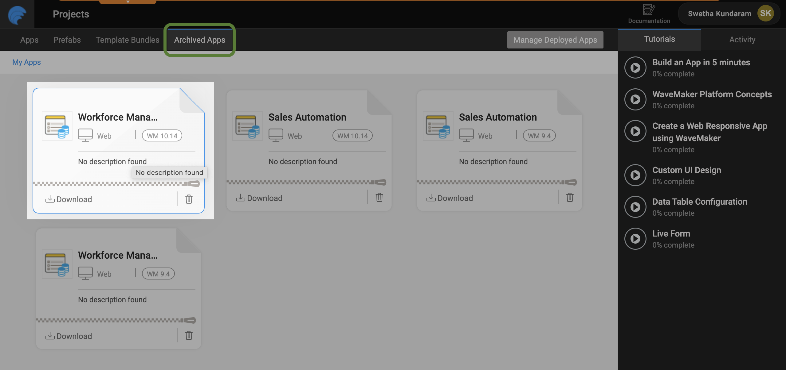 Once you complete the upgrading of the project, WaveMaker 10 project gets archived. If needed, you can access and download the older projects from the Archived Apps tab.