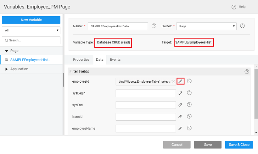 • From the Data tab, using the bind icon next to systemClause Input Field from Use Expression bind it to 'as_of ' + Widgets.date1.timestamp. This will ensure that the rows from the Employees History table are filtered based on the date selected by the user.
