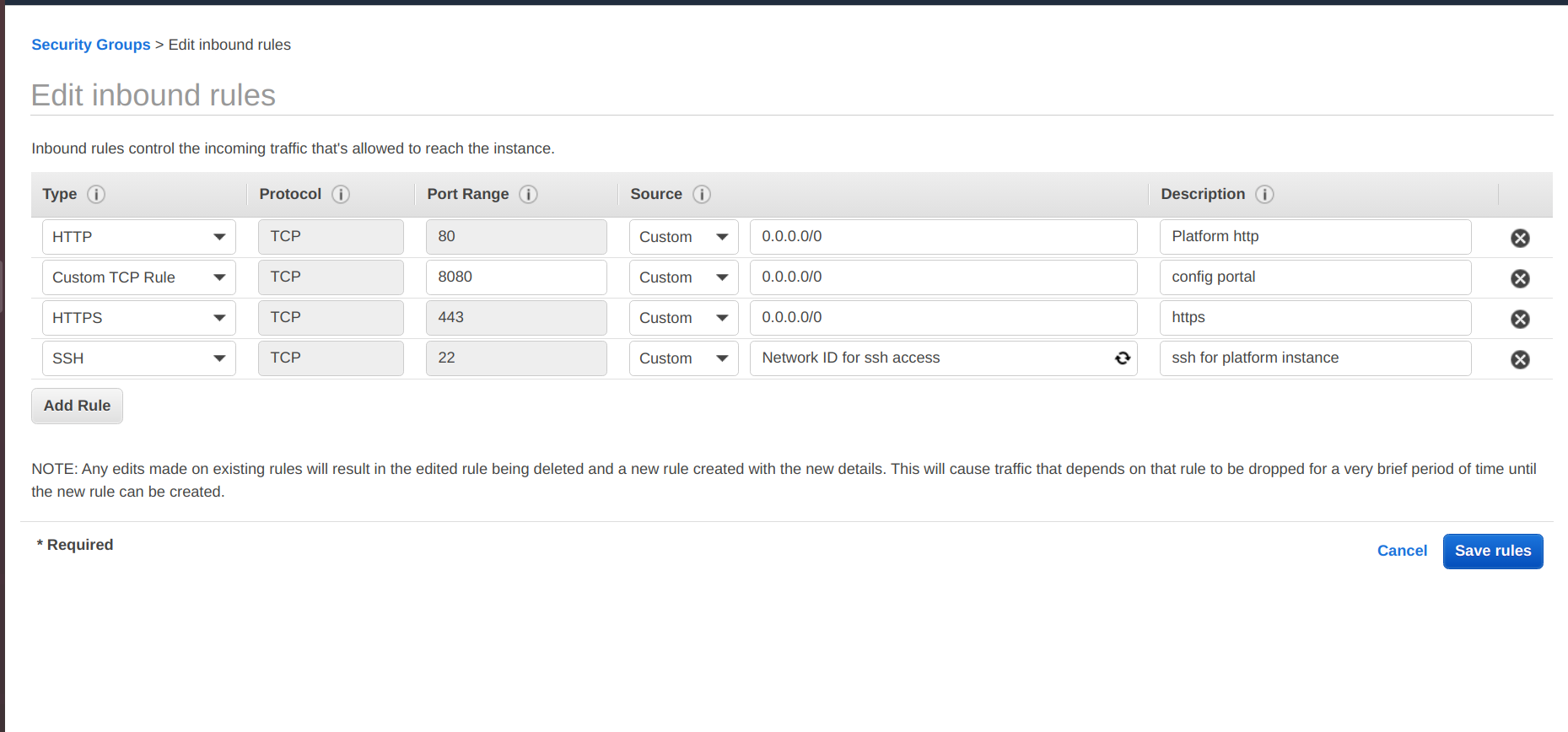 - Select inbound rules and edit rules to access from the Platform Instance. At the source field, provide WME-SG-Platform-Internal security group ID.