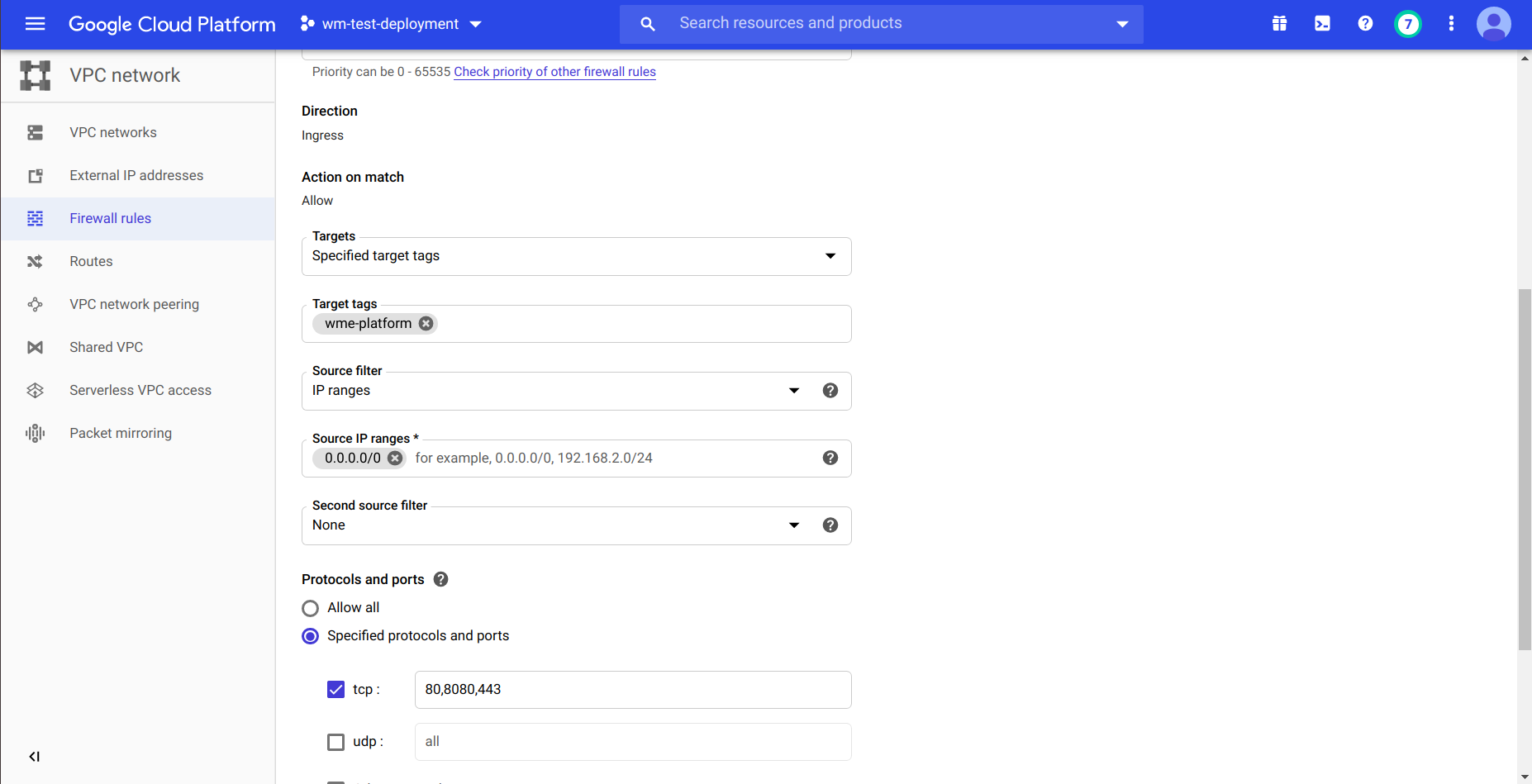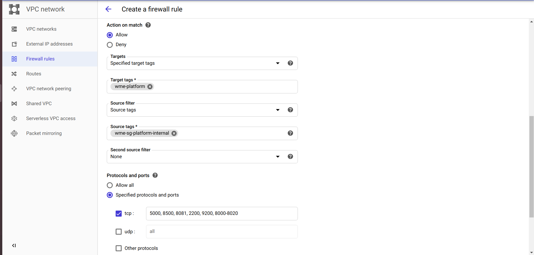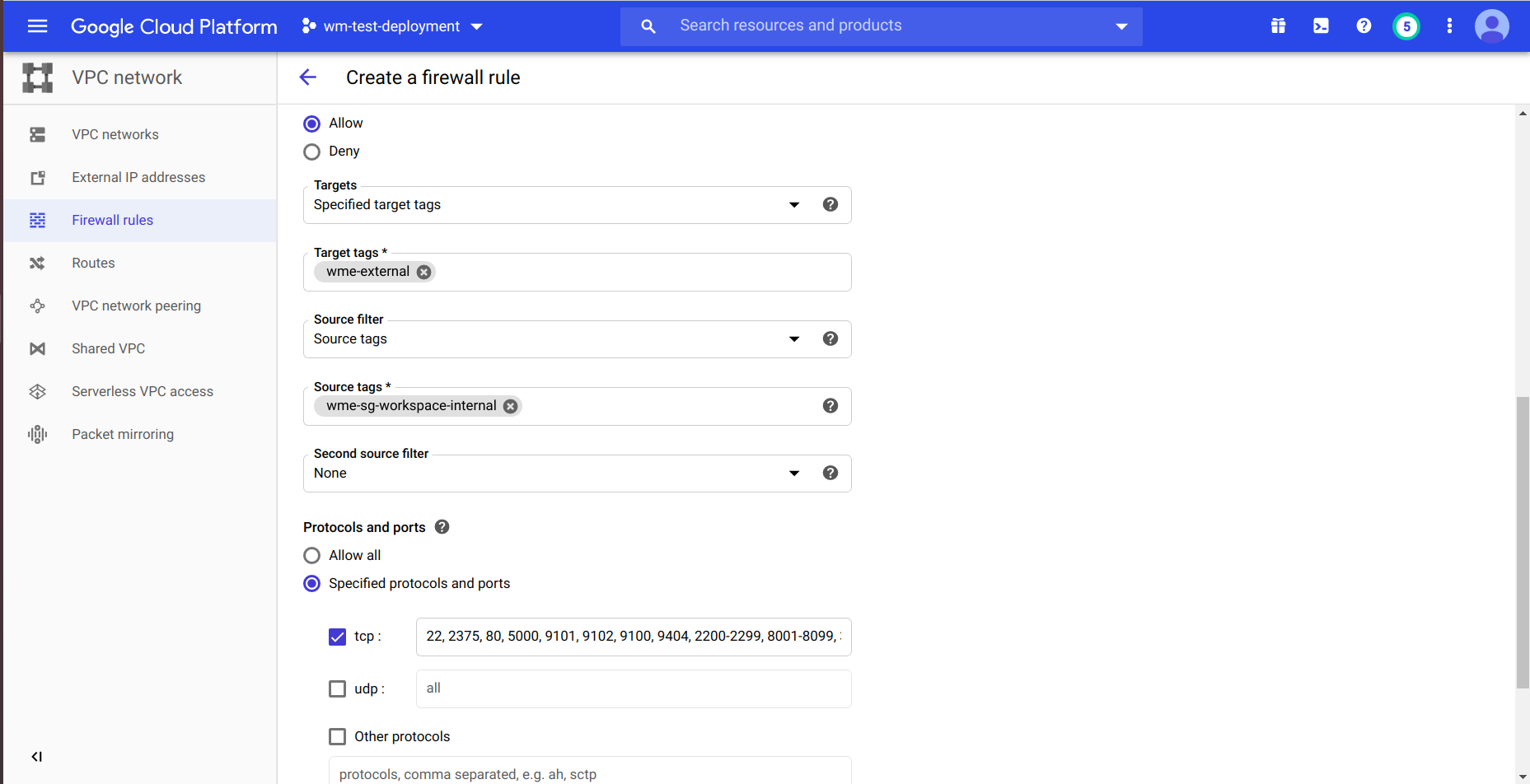 - Select target type and source filter type.by using the target we can connect the firewall rule to Instance. example the which Instance have target tag the firewall is connect to that Instance and by using the source we can open ports to specific Instance. example the which Instance have a source tag the ports will be open to that Instance. we provide this tags at network section during the Instance creation.or else you can select your own Target and Source methods.