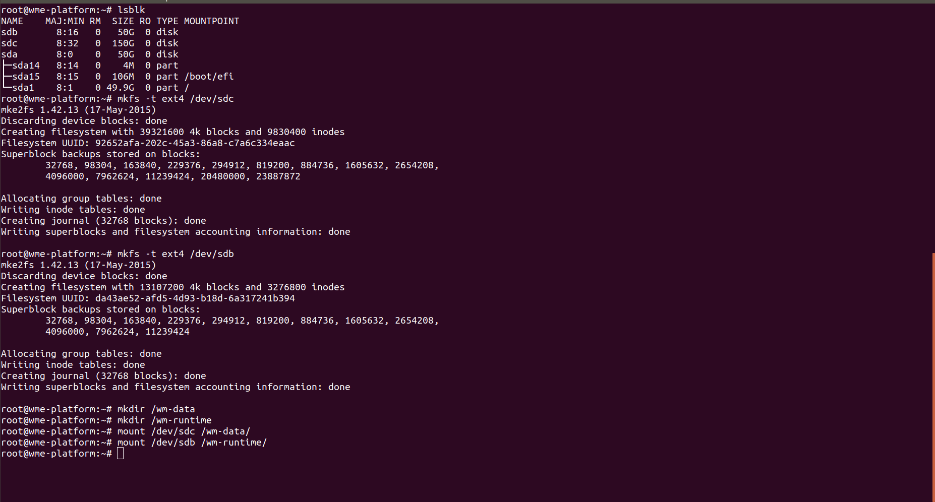 mkdircommand to create a mount point directory for the volume. The mount point is where the volume is located in the file system tree and where you read and write files after you mount the volume. For WME-Setup, create two directories using the following commands.