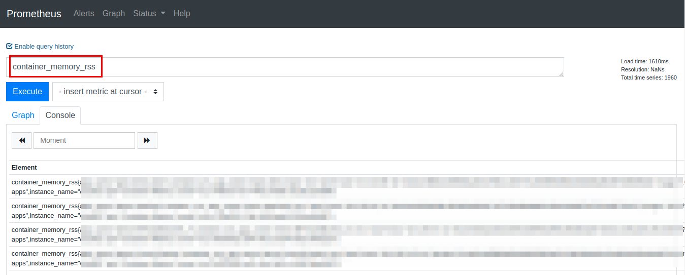 2) In the above image, we can see that the query has returned the memory metrics of multiple time series. We can select only the login metrics by using the query container_memory_rss{name="login"} as shown in the below image.